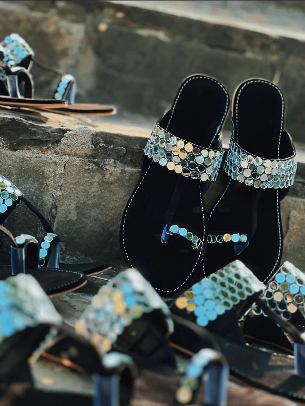 Add a touch of sparkle to your step with Shesh, our elegant black flat chappal adorned with delicate sheeshy (mirror) work. Blending traditional embellishment with a sleek modern design, Shesh is perfect for those who love subtle glamor in everyday wear.